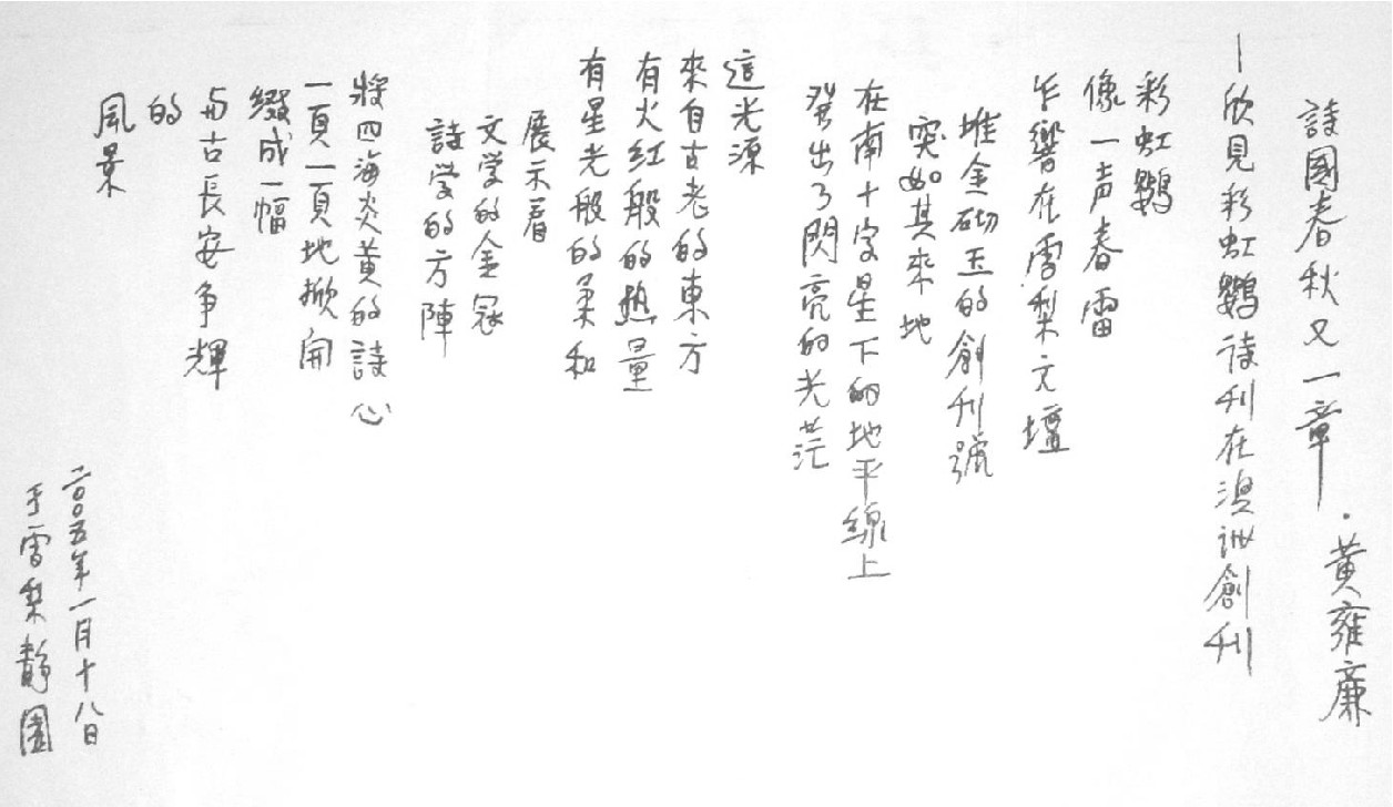 虽是寥寥数语,却足见黄会长对创刊号的重视。以下是黄会长《诗国春秋又一章》的手迹。