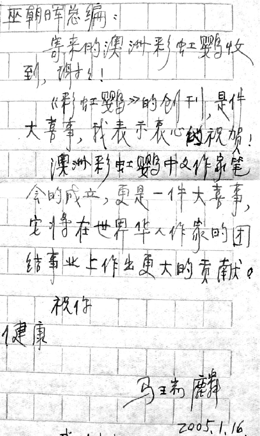 的来信中写道:“《彩虹鹦》的创刊,是件大喜事,我表示衷心的祝贺!澳洲彩虹鹦中文作家笔会的成立,更是一件大喜事,它将在世界华人作家的团结事业上作出更大的贡献。”